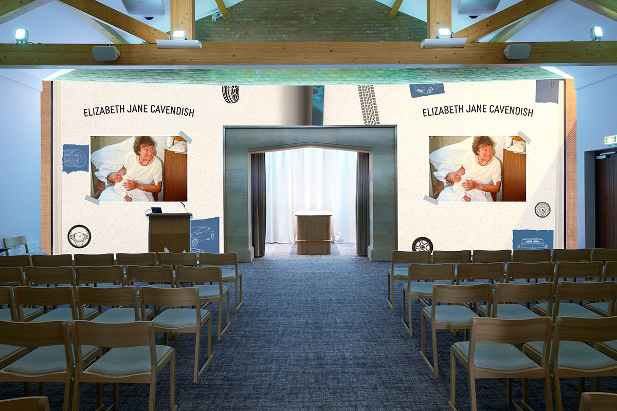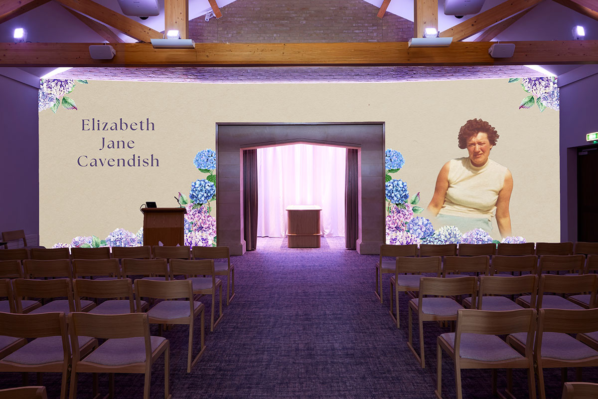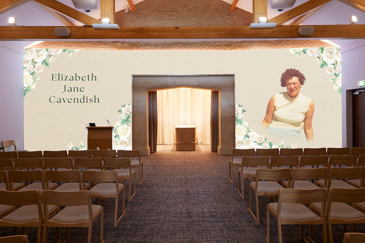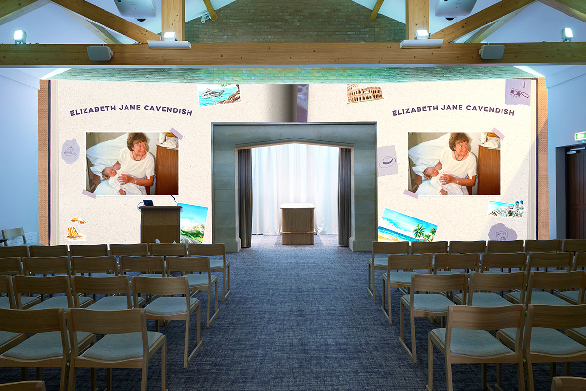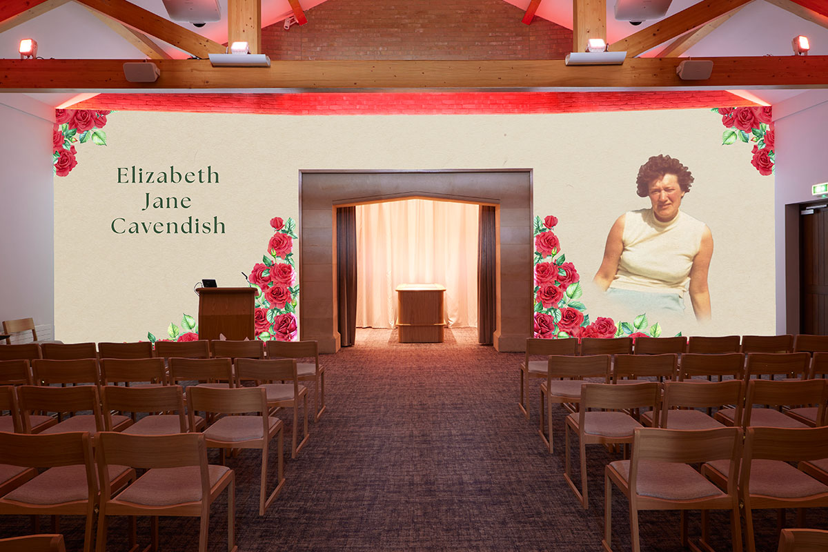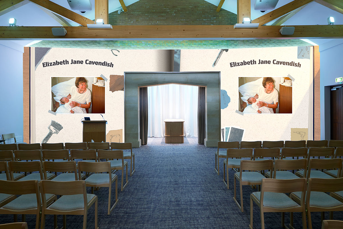 Where other UK venues can only provide visual tributes and photos of a loved one on chapel screens, our canvas wall serves as the entire visual tribute backdrop for a service.
