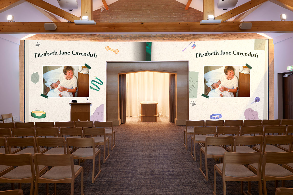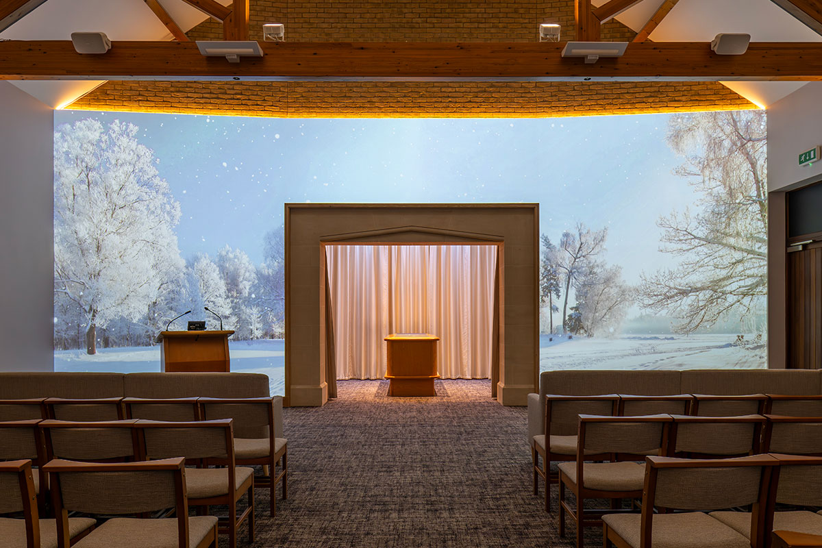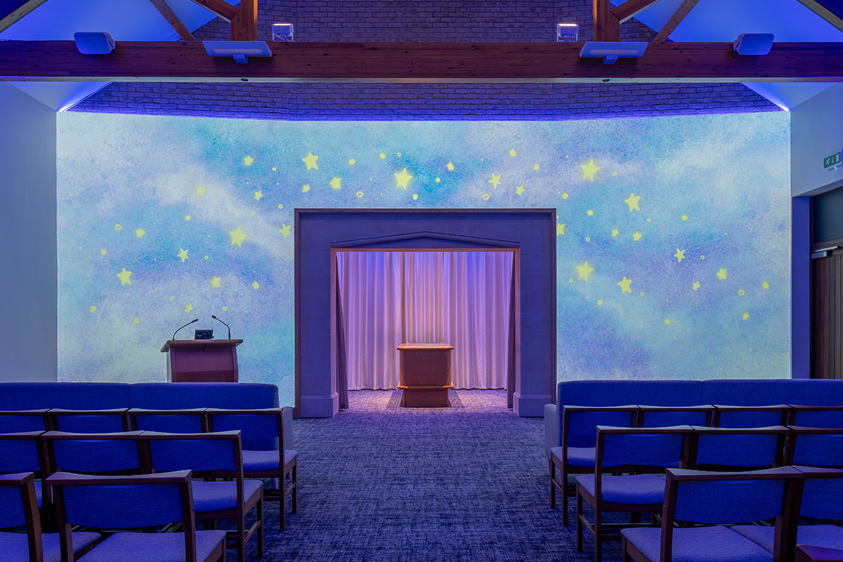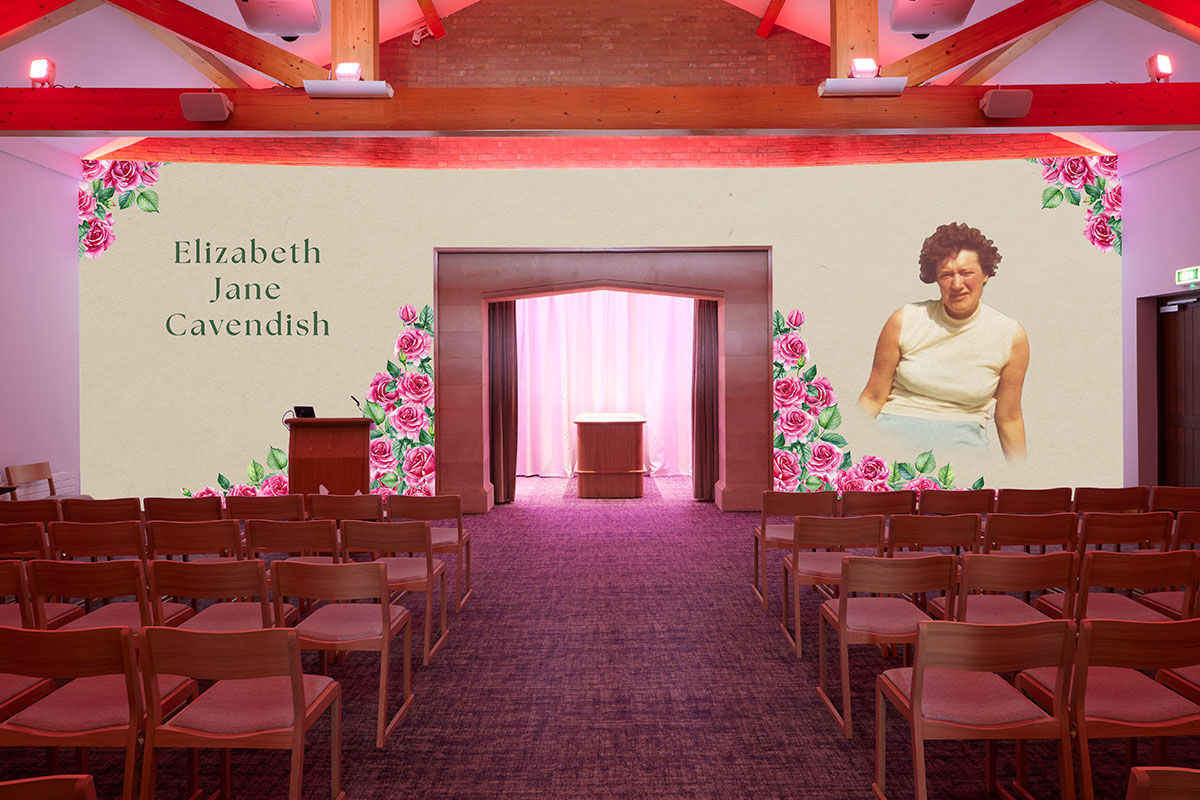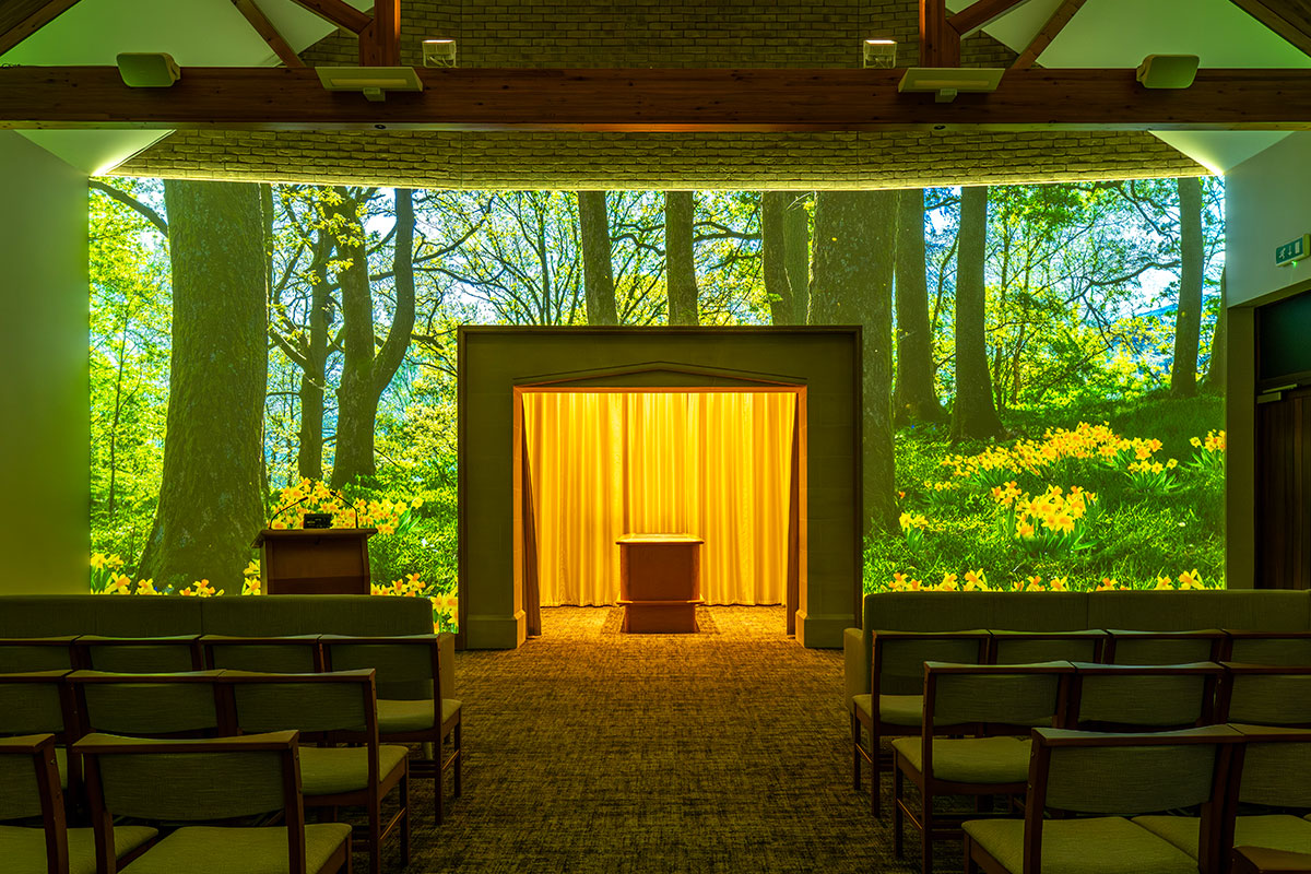Where other UK venues can only provide visual tributes and photos of a loved one on chapel screens, our canvas wall serves as the entire visual tribute backdrop for a service.