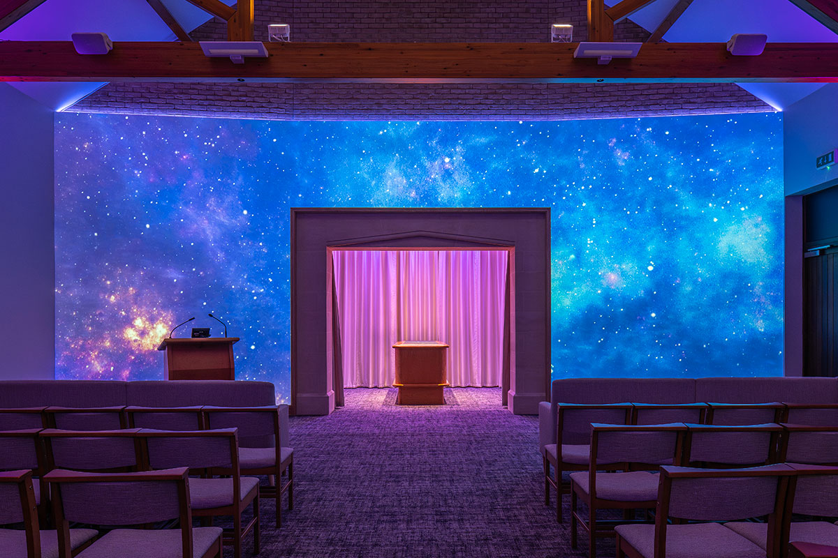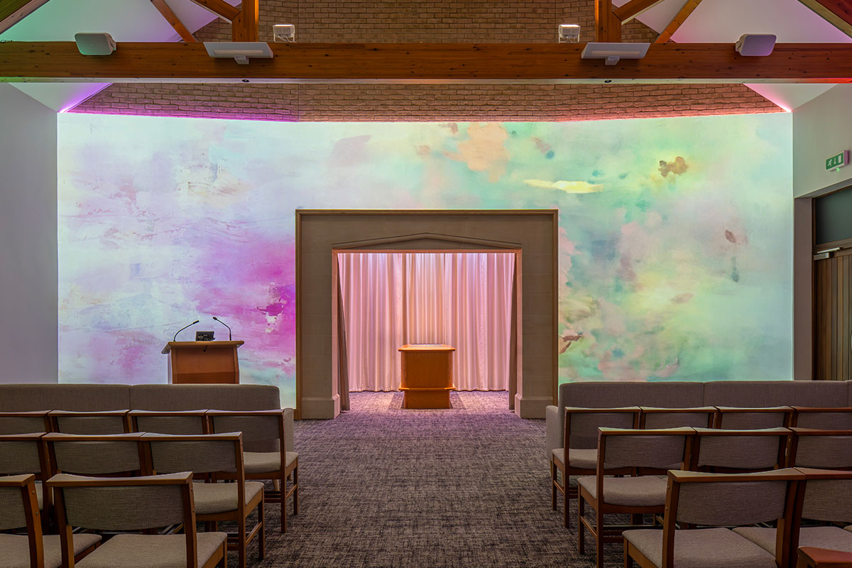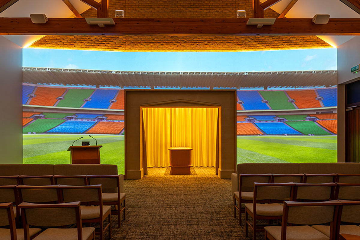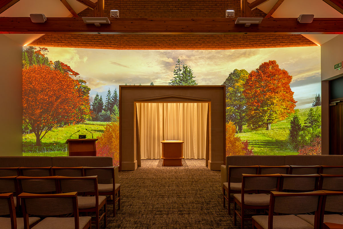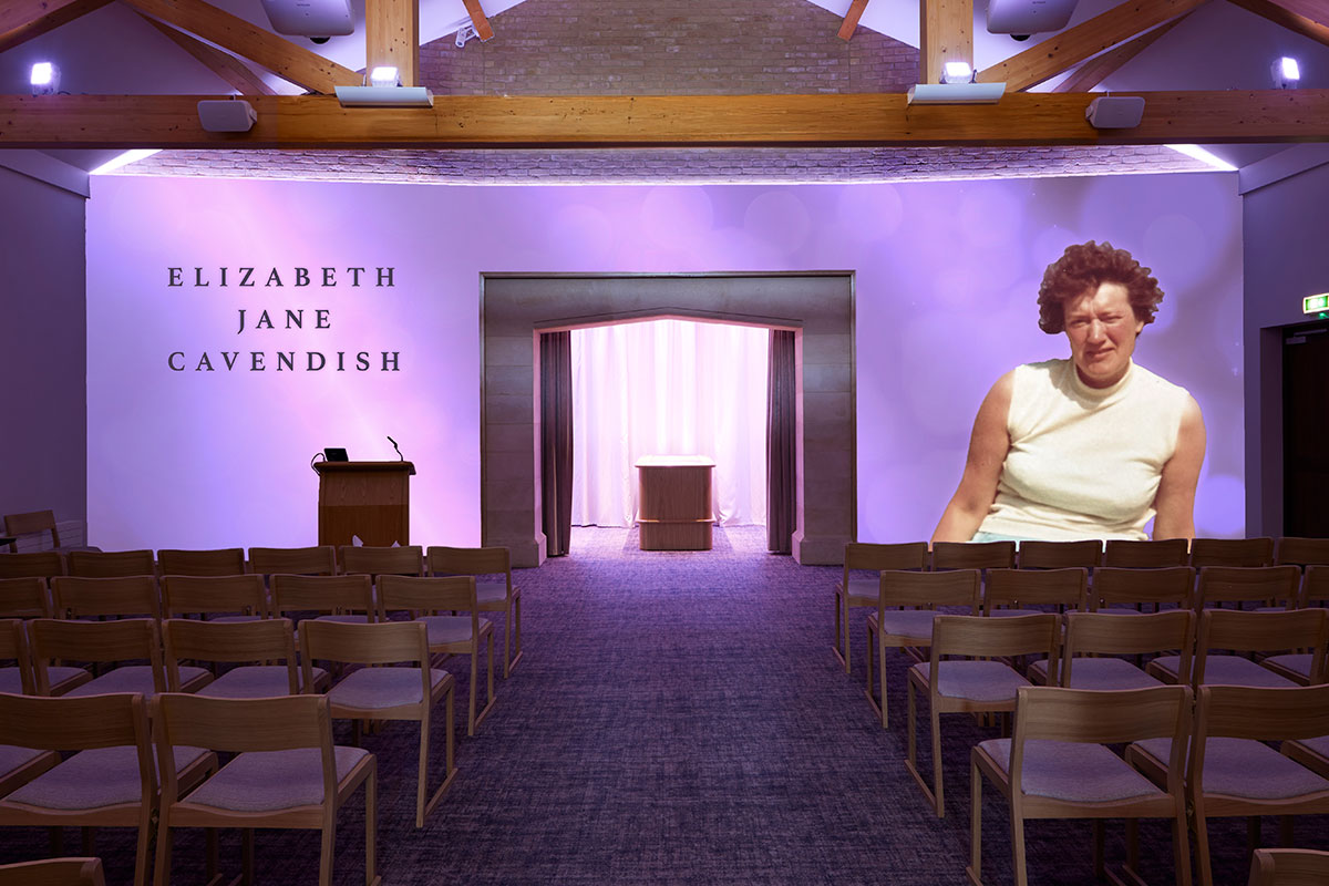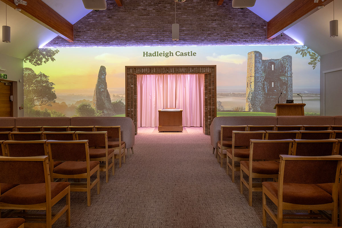 Where other UK venues can only provide visual tributes and photos of a loved one on chapel screens, our canvas wall serves as the entire visual tribute backdrop for a service.